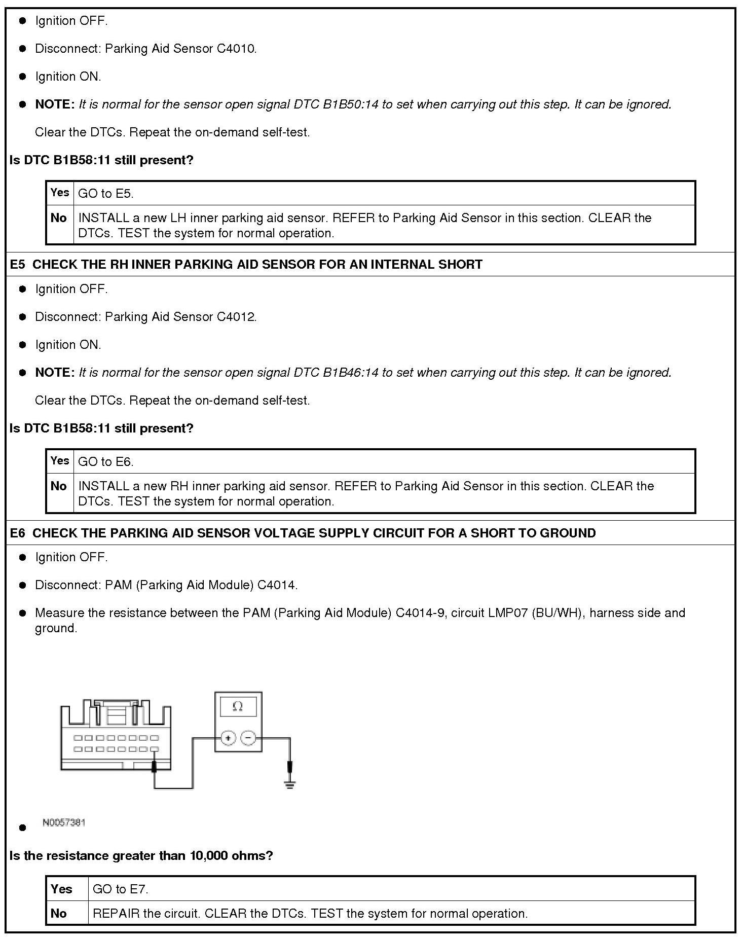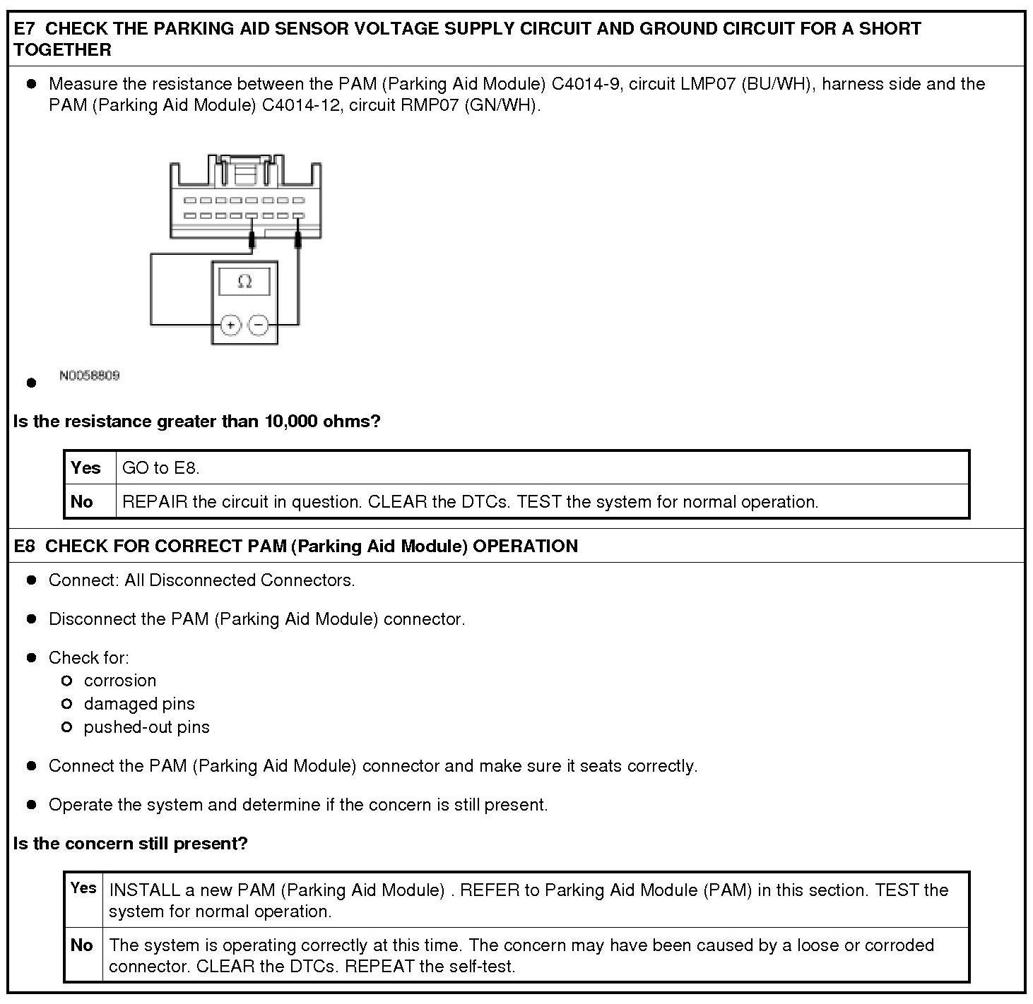 The Parking Aid Module (PAM) supplies a reference voltage and signal return to the parking aid sensors. A fault condition occurs when the PAM (Parking Aid Module) detects a short to ground or signal return circuit on the parking aid sensor voltage supply circuit.