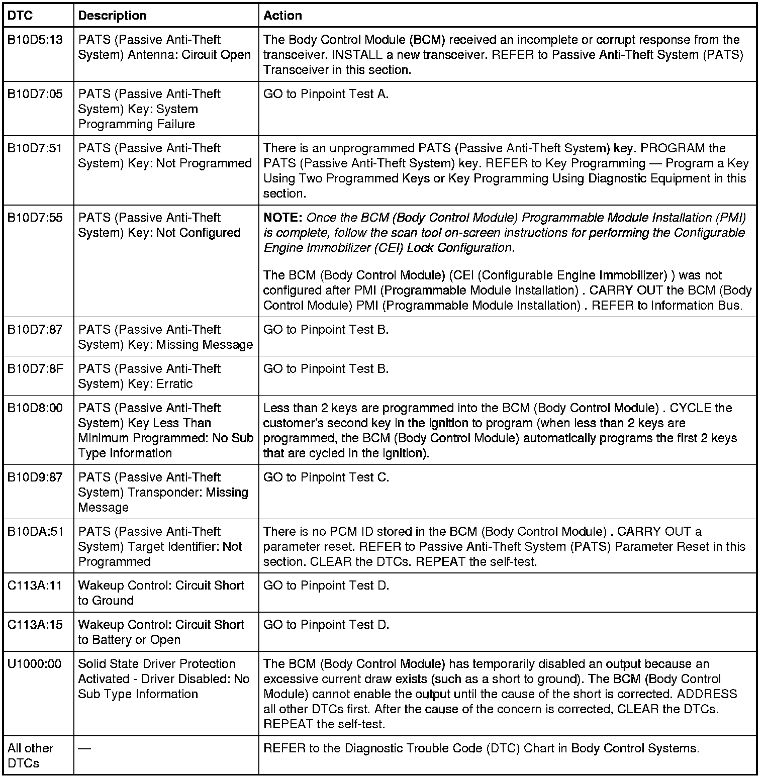 Body Control Module (BCM) DTC Chart