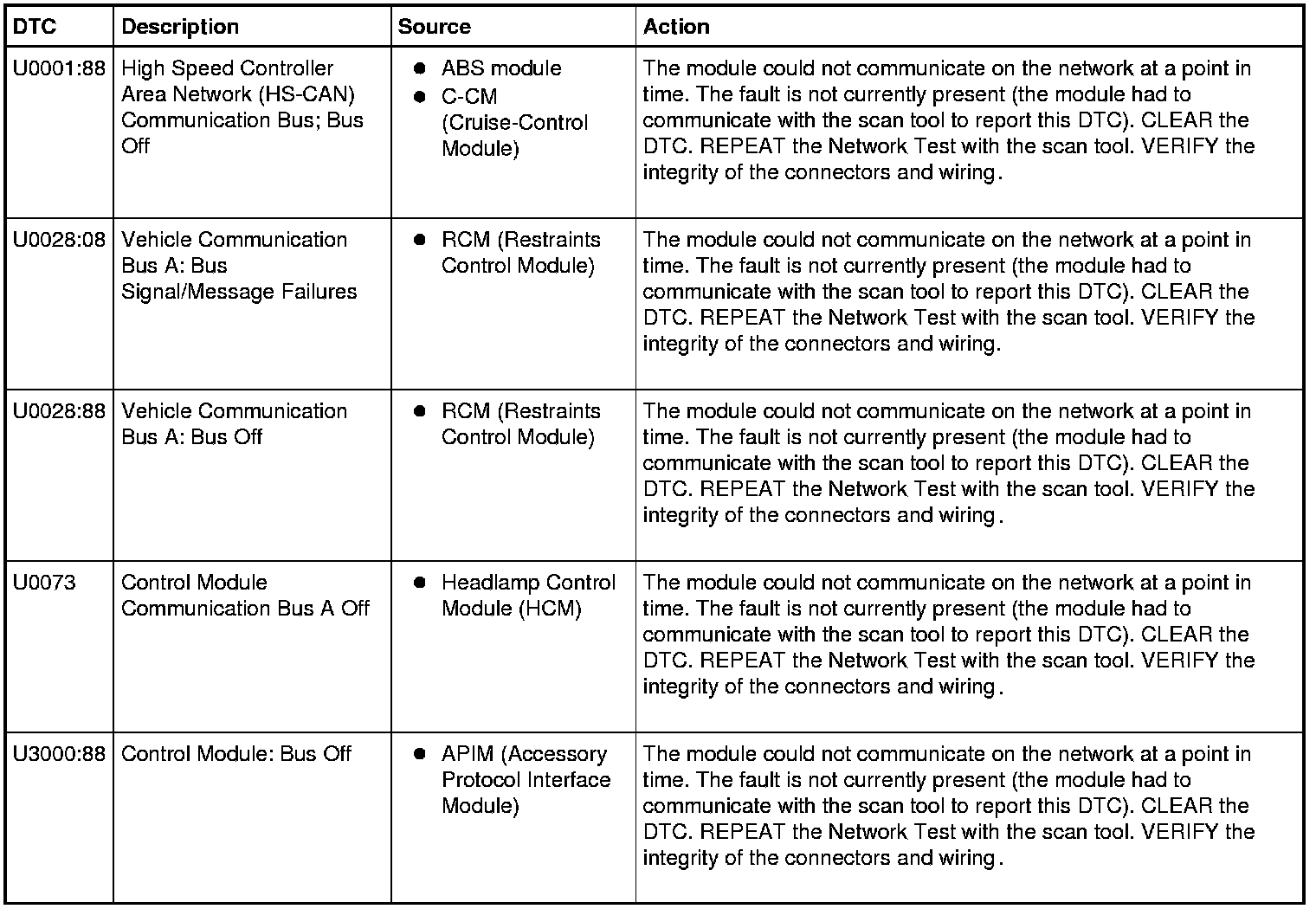 NOTE: Network DTCs (U-codes) are often a result of intermittent concerns such as damaged wiring or low battery voltage occurrences. Additionally, vehicle repair procedures such as module reprogramming often set network DTCs. Replacing a module to resolve a network DTC is unlikely to resolve the concern. To prevent repeat network DTC concerns, inspect all network wiring, especially connectors. Test the vehicle battery, refer to Battery.