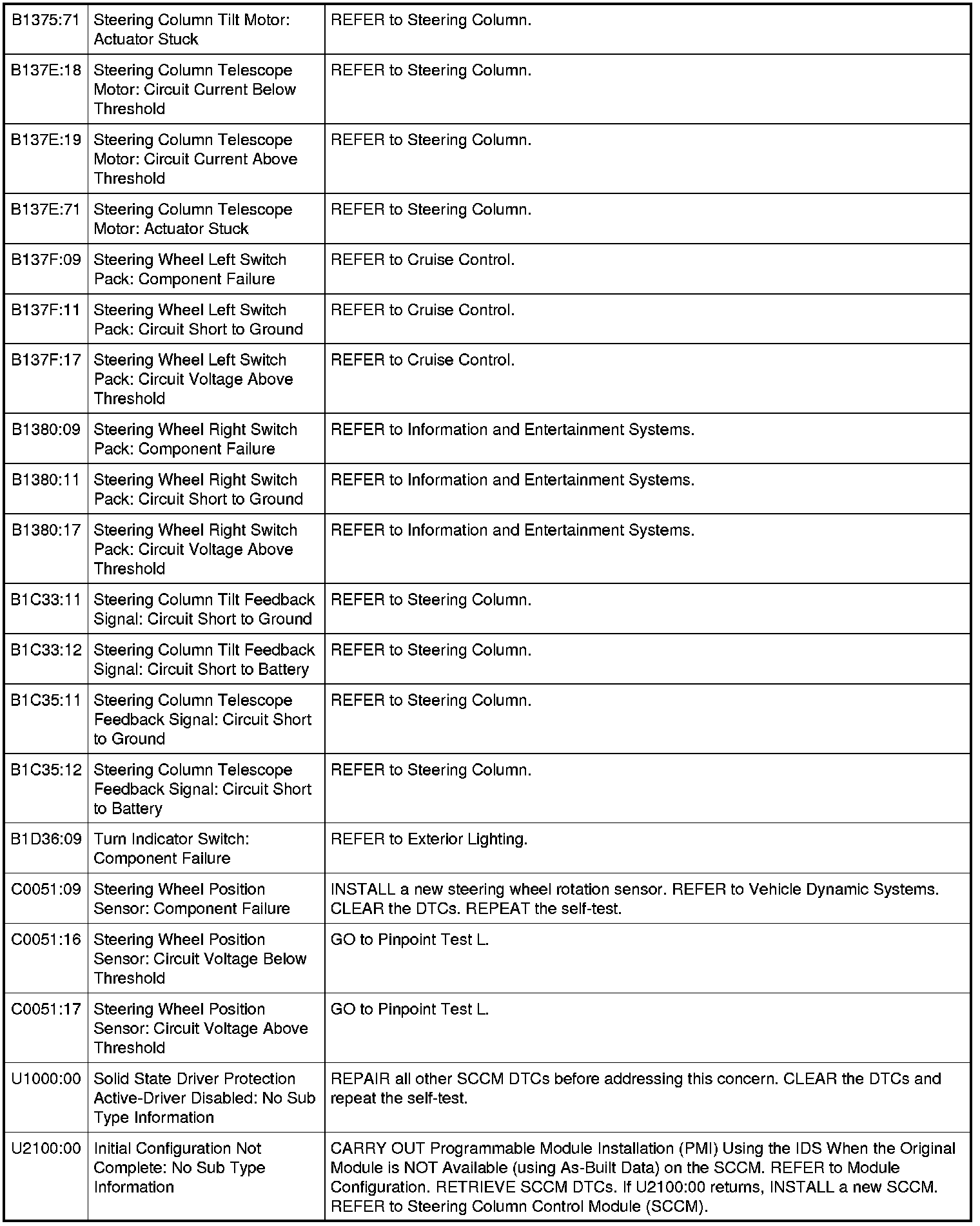 Steering Column Control Module (SCCM) DTC Chart