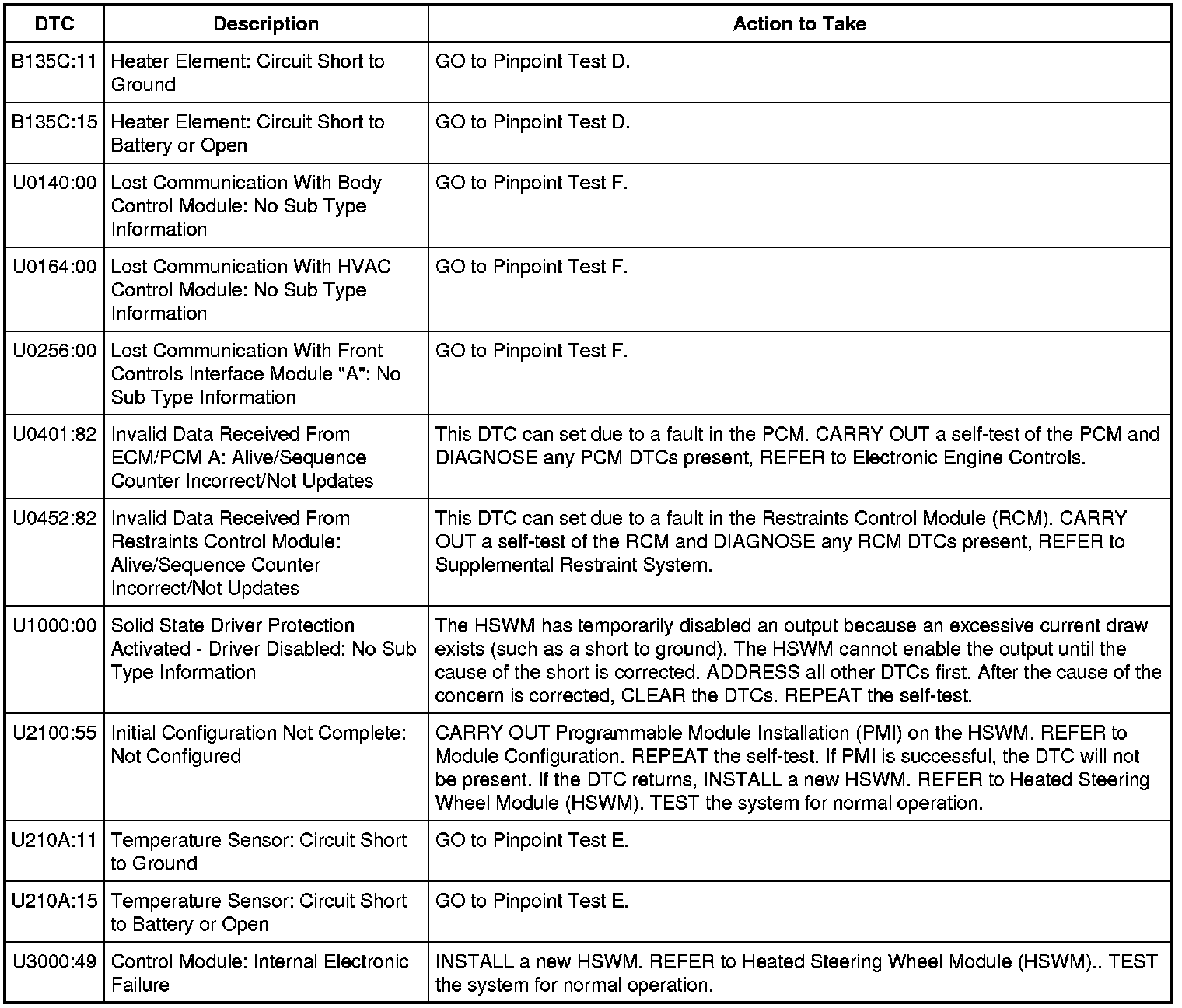 Heated Steering Wheel Module (HSWM) DTC Chart
