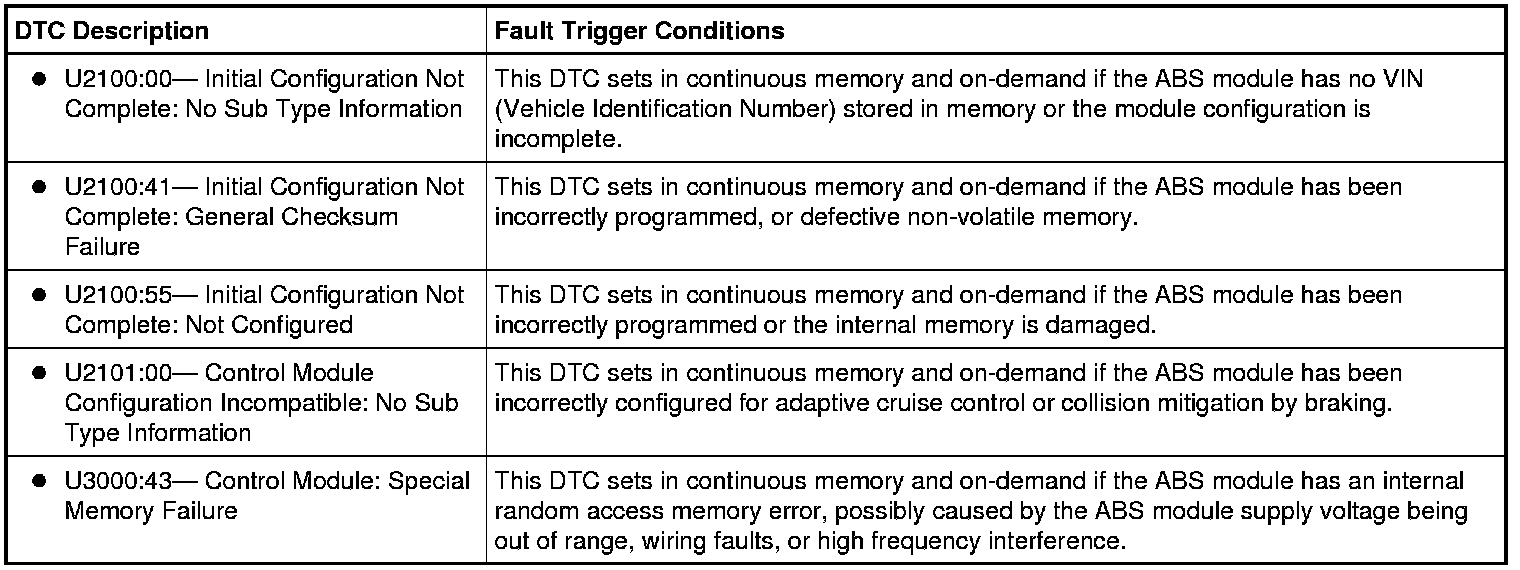 CLEAR the DTCs. CYCLE the ignition key. WAIT 1 minute before ignition ON. REPEAT the self-test. If DTC U2100:00, U2100:41, U2100:55, U2101:00, or U3000:43 returns, INSTALL a new ABS module. REFER to Anti-Lock Brake System (ABS) Module Service and Repair.