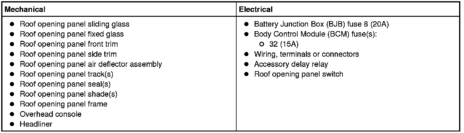 4. If the concern is not visually evident, determine the symptom. GO to Symptom Chart- Roof Opening Panel Symptom Chart - Roof Opening Panel or GO to Symptom Chart- NVH Symptom Chart - NVH.
