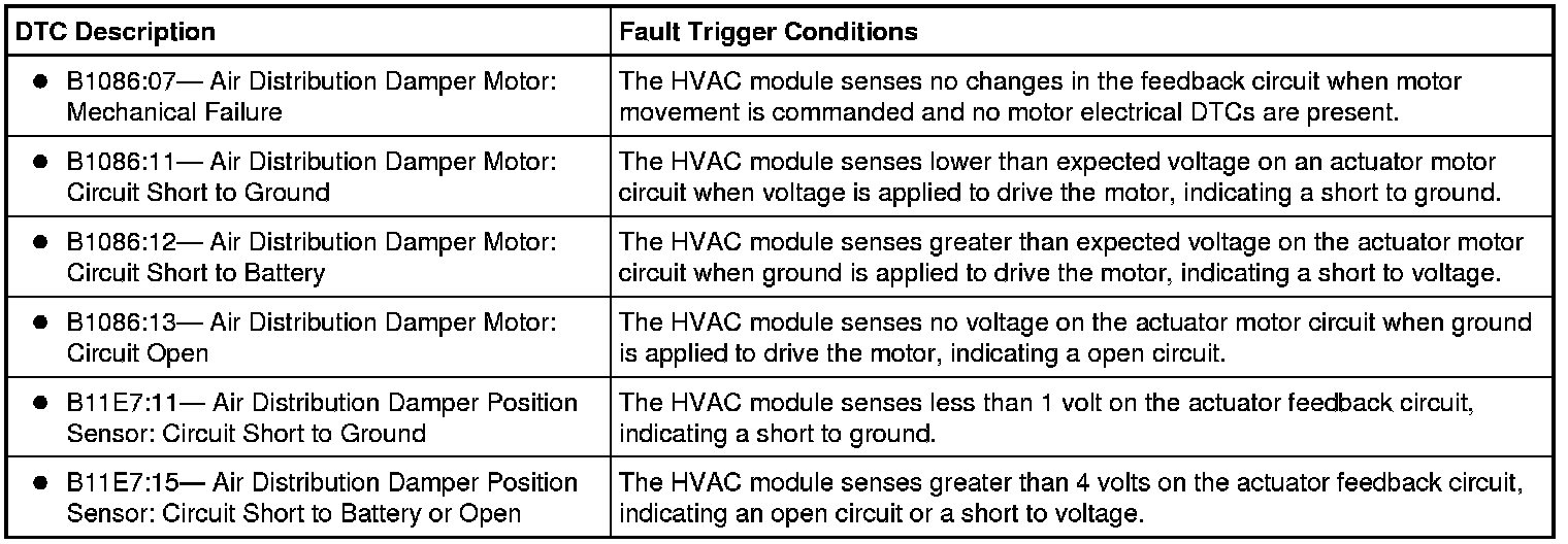 For DTC B1086:07, INSPECT for binding/damaged linkage or door. REPAIR as necessary. If no condition is found, INSTALL a new defrost/panel/floor door actuator. CLEAR the DTCs. REPEAT the self-test. TEST the system for normal operation.