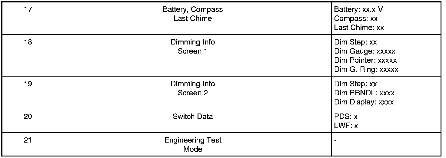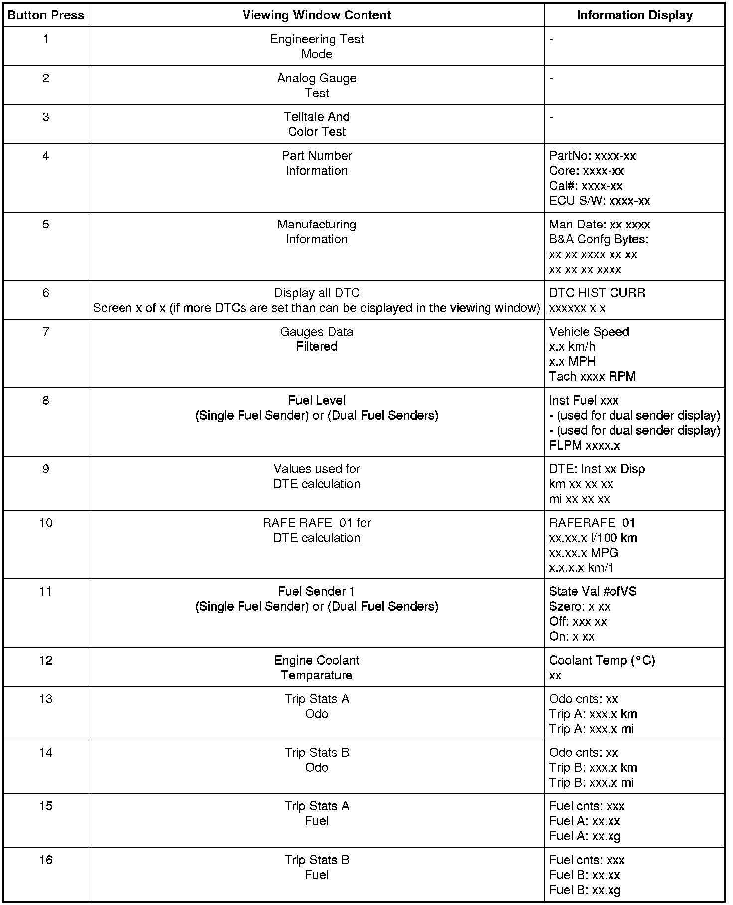 NOTE: Some of the displays listed in the table below use xxx's to represent a numeric or alpha-numeric value. The value may display the same amount of characters represented by the xxx's or there may be more/less depending on the type of display. For example: DTC HIST CURR xxxxxx x x may display DTC HIST CURR C10000 X. Note that there were 8 x's in the display description but only 7 digits in the actual display.