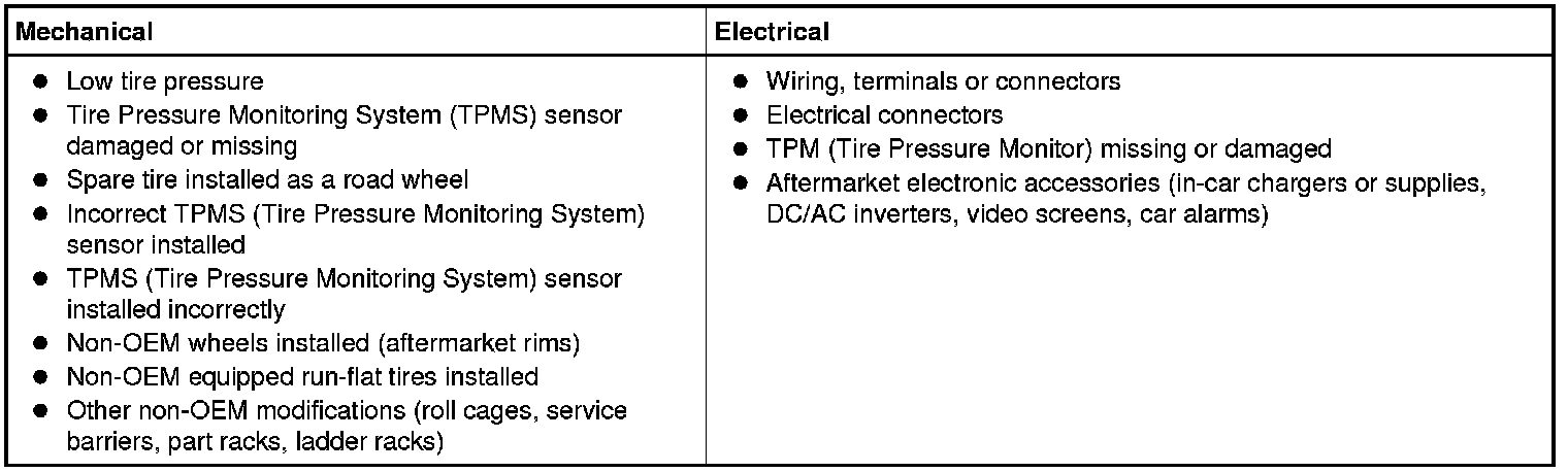 - Certain non-OEM electronic equipment may cause RFI (Radio Frequency Interference) and false TPMS (Tire Pressure Monitoring System) warnings. To aid in diagnosis, obtain information from the owner regarding any equipment that has been added or was in use at the time the TPMS (Tire Pressure Monitoring System) fault occurred.