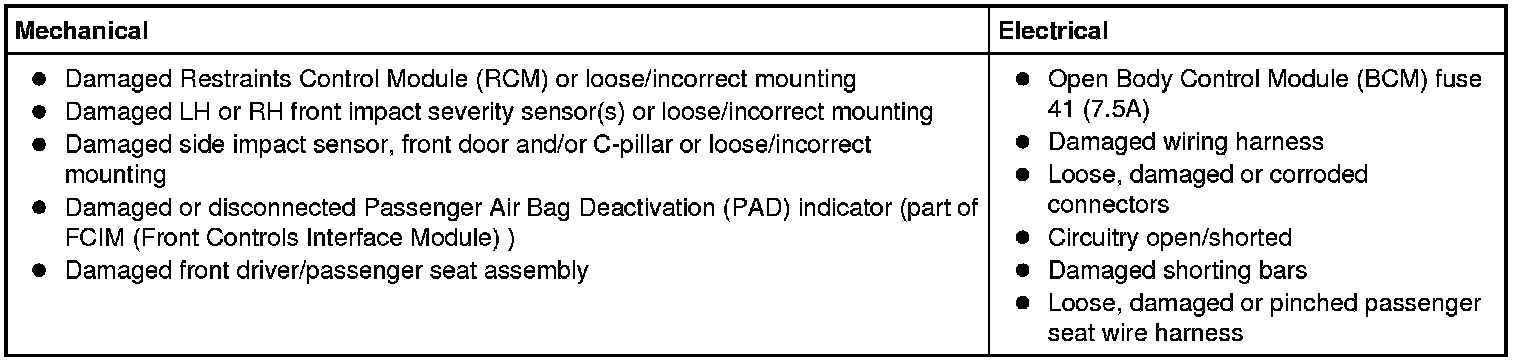 8. If the DTCs retrieved are related to the concern, go to the Restraints Control Module (RCM) DTC Chart or Occupant Classification System Module (OCSM) DTC Chart Air Bag Systems. For all other DTCs, refer to Body Control Systems.