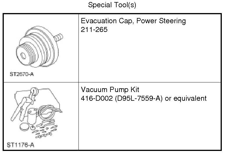 12. Install the Power Steering Evacuation Cap and the Vacuum Pump Kit. Apply and maintain the maximum vacuum of 68-85 kPa (20-25 in-Hg).