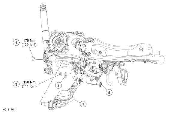NOTICE: Tighten the suspension bushing fasteners with the weight of the vehicle resting on the wheels and tires or incorrect clamp load and bushing damage may occur.
