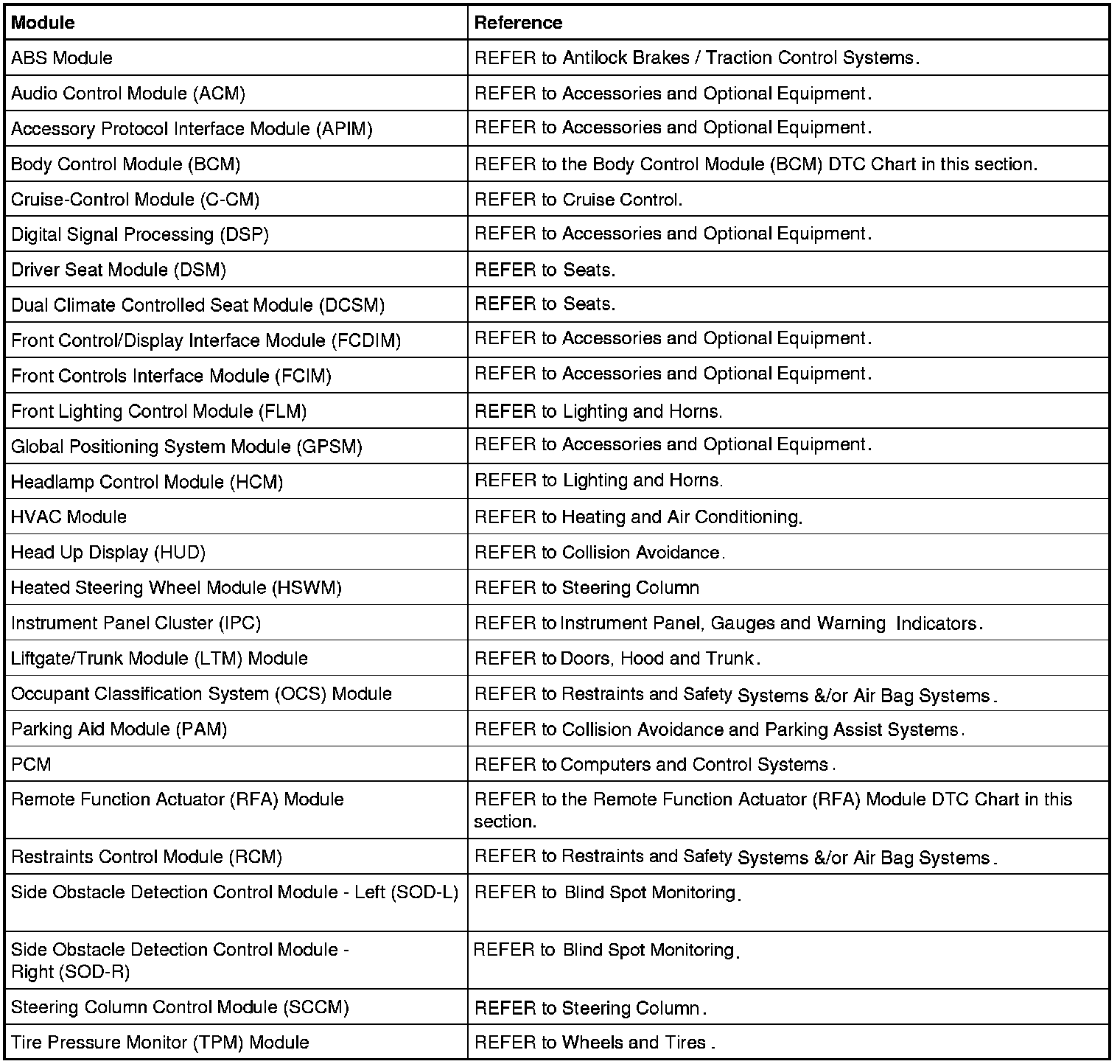 Each module has a comprehensive DTC chart listed in an appropriate system. Refer to the table below for the appropriate system.