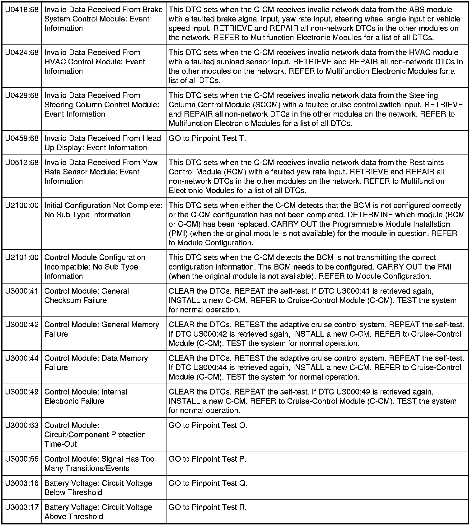 NOTE: This module utilizes a 5-character DTC followed by a 2-character failure-type code. The failure-type code provides information about specific fault conditions such as opens, or shorts to ground. Continuous memory DTCs have an additional 2-character DTC status code suffix to assist in determining DTC history.