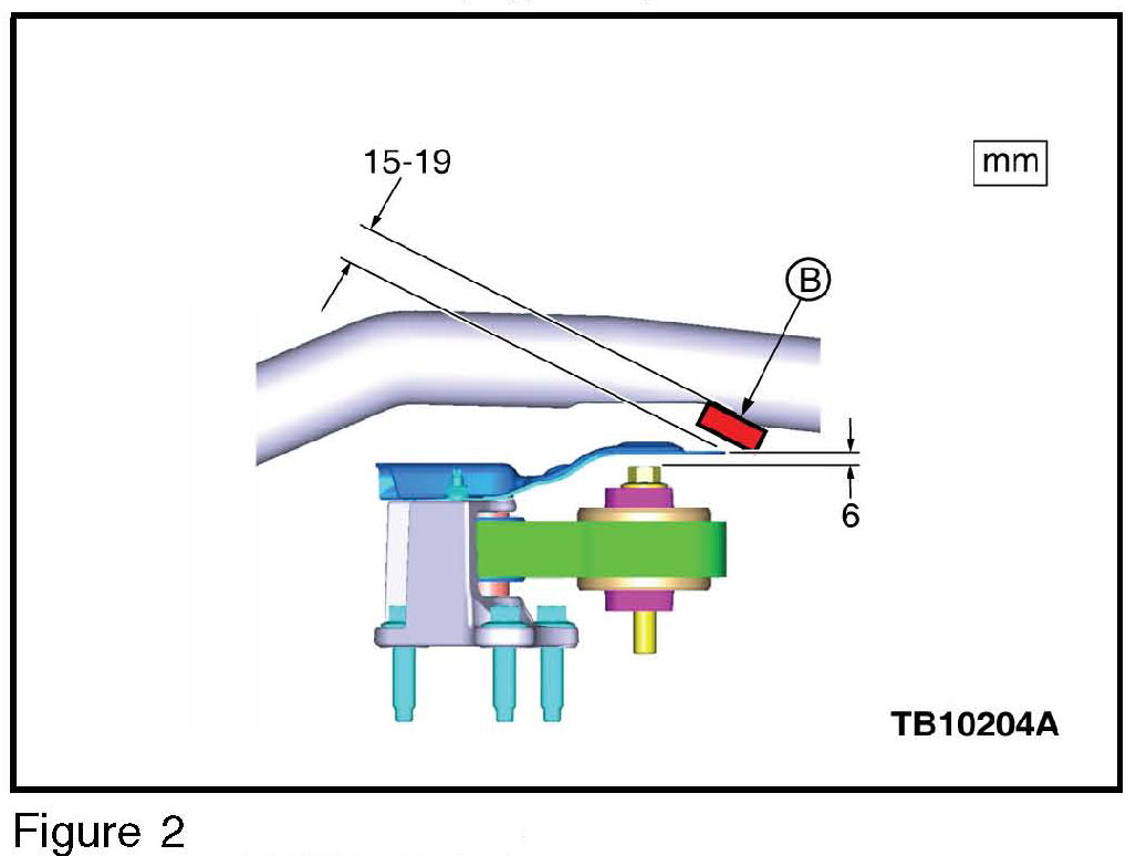 a. Place a 19 mm (3/4") block of wood or equivalent to support the tip of the roll restrictor heat shield to ensure the exhaust pipe to roll restrictor heat shield clearance is not reduced. (Figure 2)