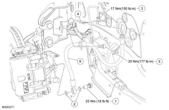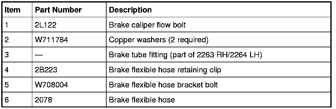 1. Remove the brake caliper flow bolt and discard the 2 copper washers.