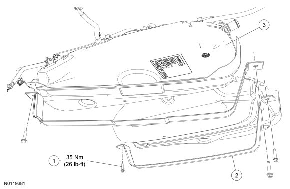 13. Disconnect the fuel tank fuel vapor tube assembly from the retainers and remove the fuel tank fuel vapor tube assembly.