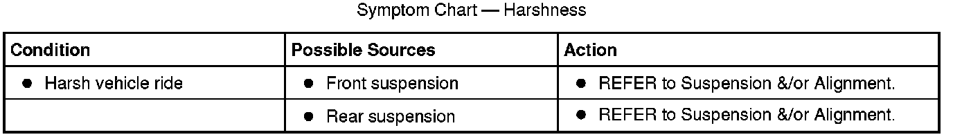Harshness is customer perception which gives the impression of no isolation from the tire/wheel and suspension system. Harshness may be caused by road conditions, temperature changes, component damage and/or incorrect customer modifications on original components/specifications. Customers usually experience harshness when the vehicle is driving over bumps or potholes and in cold weather conditions. Harshness can also be experienced with excessive tire pressure, sporty tires, heavy-duty springs and shocks, or other vehicle modifications. Some aftermarket tires, even with the correct size, may change vehicle behavior and produce customer concerns. The first step in diagnosing a harshness concern is to determine if the concern was experienced only in certain specific operating conditions, such as large potholes or extremely cold weather. In these cases, harshness should be considered normal. A known good vehicle can be driven under the same conditions and the rides can be compared to determine whether the concern is normal or vehicle specific. The second step is to check tire pressure and make sure it was set within vehicle specifications. The third step is to inspect for aftermarket or modified components and determine if they are the cause of the harshness complaint. If the harshness concern persists after the above steps, it is possible that some components are damaged. Based on the results from the road test, make a determination of which action in the symptom chart to take first.