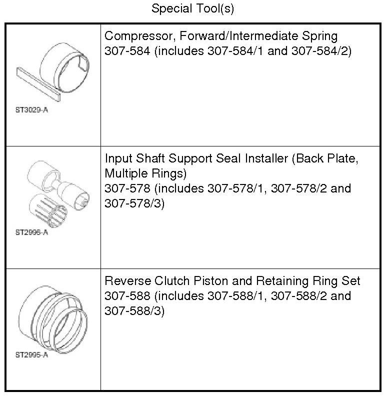 12. Install the Forward/Intermediate Spring Compressor 307-584/2 and the Reverse Clutch Piston and Retaining Ring Set 307-588/3.