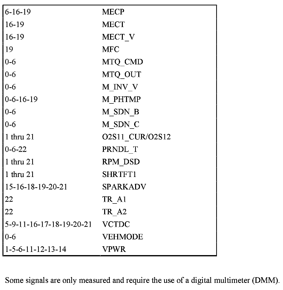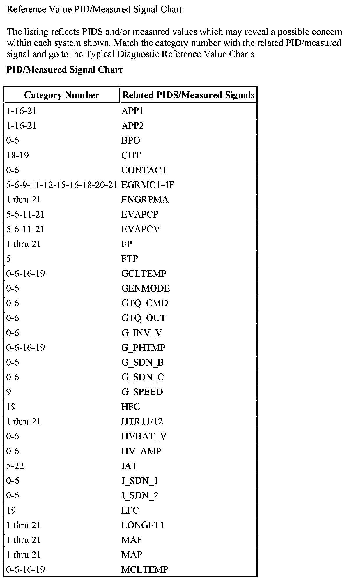 REFERENCE VALUE PID/MEASURED SIGNAL CHART
