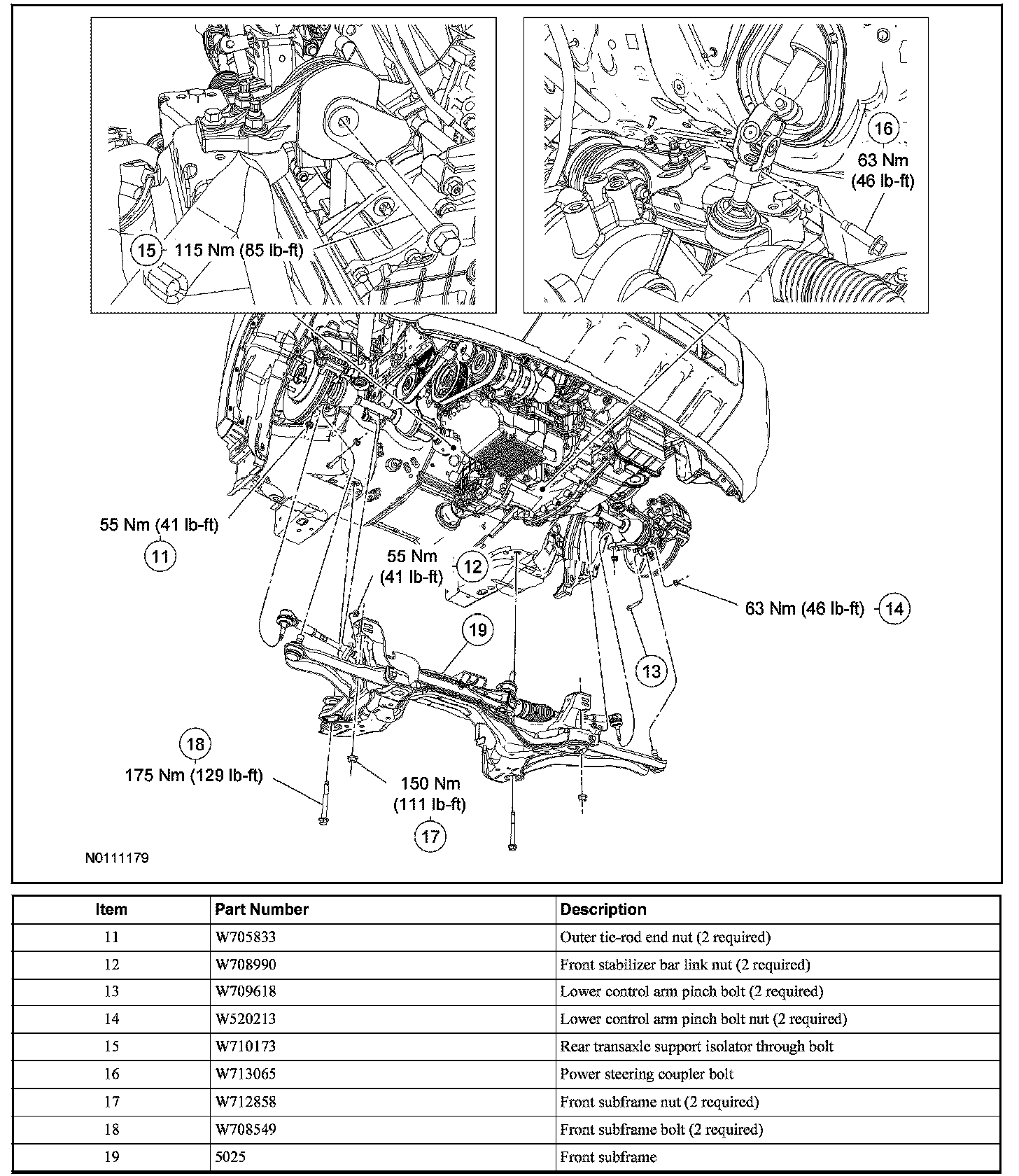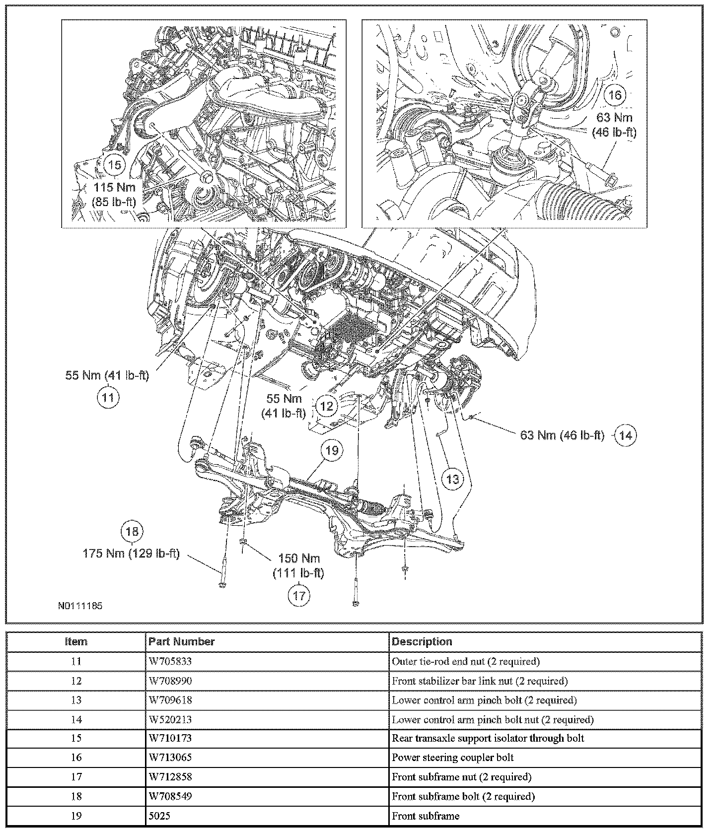 - When installing the front subframe rear bolts, make sure both of the front subframe rear bolts are fully engaged in their cage nuts before tightening to specification.