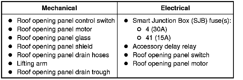 4. If the cause is not visually evident, GO to Symptom Chart - Roof Opening Panel or GO to Symptom Chart - NVH. Symptom Chart - Roof Opening Panel Symptom Chart - NVH