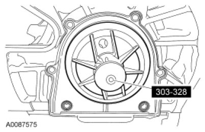 NOTICE: Do not loosen or remove the crankshaft pulley bolt without first installing the special tools as instructed in this procedure. The crankshaft pulley and the crankshaft timing sprocket are not keyed to the crankshaft. The crankshaft, the crankshaft sprocket and the pulley are fitted together by friction, using diamond washers between the flange faces on each part. For that reason, the crankshaft sprocket is also unfastened if the pulley bolt is loosened. Before any repair requiring loosening or removal of the crankshaft pulley bolt, the crankshaft and camshafts must be locked in place by the special service tools, otherwise severe engine damage may occur.