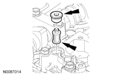 46. Install the Variable Camshaft Timing (VCT) system oil filter and the plug in the intake camshaft thrust cap.