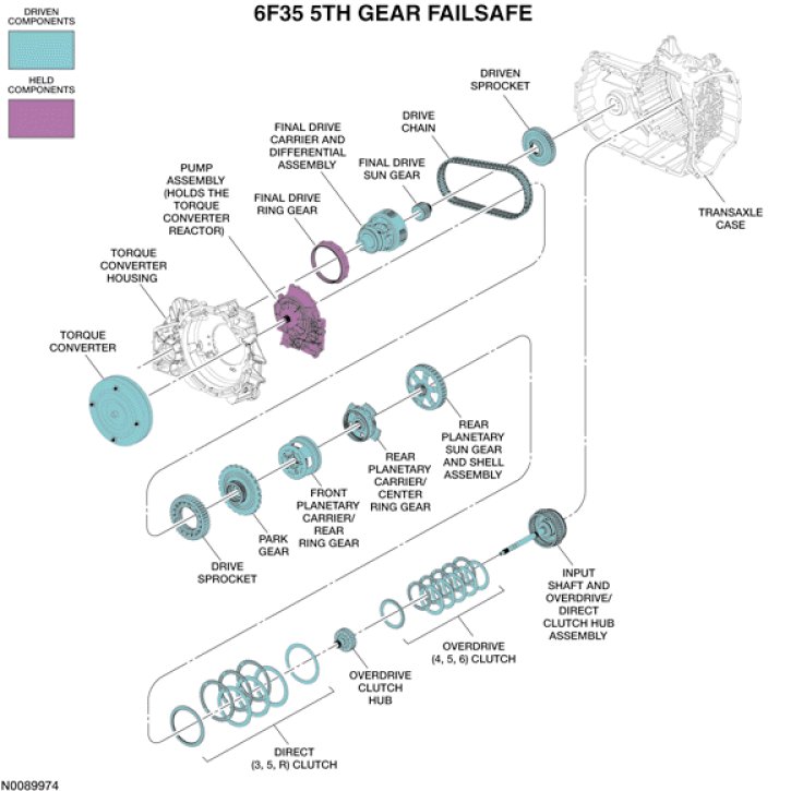 When the transaxle has an electrical, hydraulic or mechanical failure, the PCM removes ground (control) from the shift, TCC and LPC solenoids. The uncontrolled solenoids default to their normal states. SSB, SSD and the LPC solenoid are normally high solenoids which means in their normal state, they provide high pressure to the valves they control. This provides only 5th gear with maximum line pressure.
