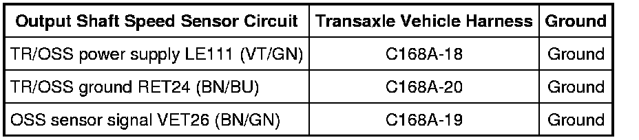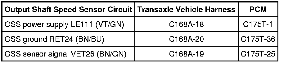 NOTE: Refer to the Solenoid Body Leadframe-to-Output Shaft Speed (OSS) Sensor Pin Internal Circuit Diagram illustration within the Transaxle Connector Layouts Transaxle Connector Layouts procedure.