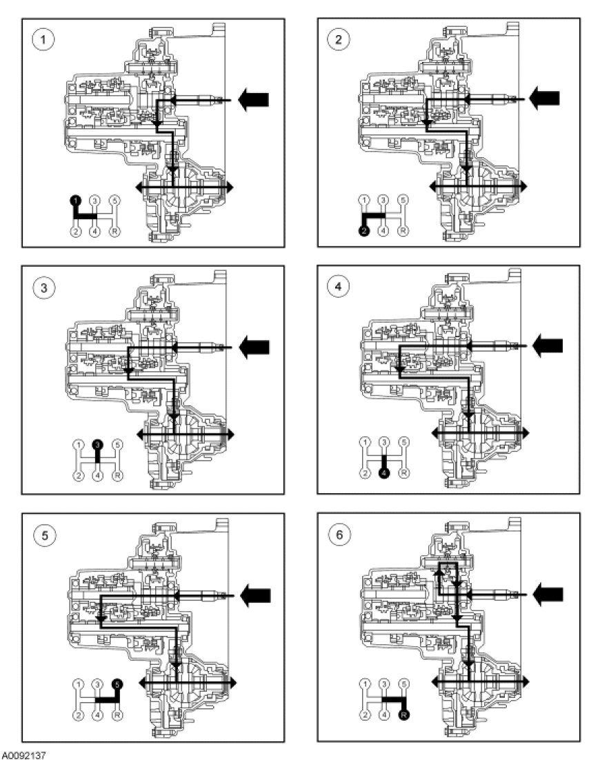 The manual transaxle is a fully synchronized 5-speed transaxle. The forward gears are selected by a synchronizer mechanism. The 3rd gear, 4th gear and 5th gear synchronizers are mounted on the input shaft. First gear and 2nd gear synchronizers are mounted on the mainshaft. The helical-cut forward gears are in constant mesh with the corresponding gears on the opposing shaft. The manual transaxle features a synchronized reverse gear. The reverse gears have helical-cut teeth and are engaged through a synchronizer.