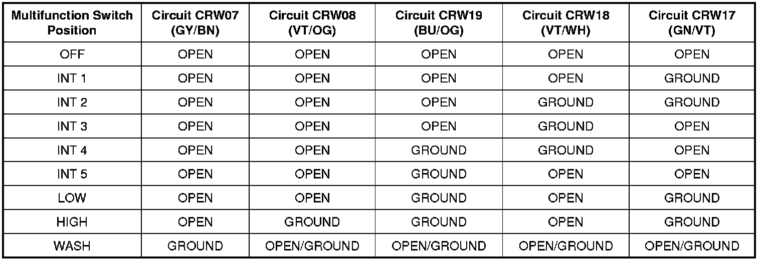 Windshield Wiper Circuit Function Table