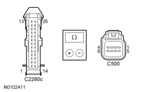 - Measure the resistance between the Keyless Entry Keypad C500, harness side and ground as follows: