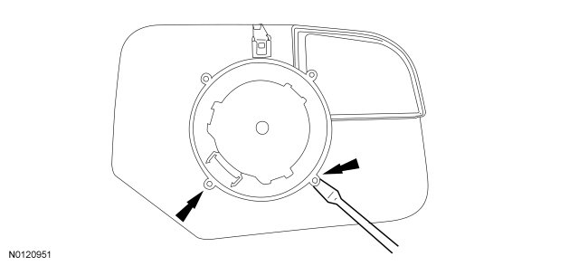 Using the thin, flat-blade screwdriver, remove the exterior mirror glass by releasing the tabs. Starting at the lower outboard side of the mirror and continuing to the lower inboard side.