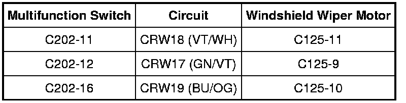 Under normal operation, the windshield wiper motor receives open and ground inputs from the multifunction switch through circuits CRW17 (GN/VT), CRW18 (VT/WH), CRW19 (BU/OG) and CRW08 (VT/OG) to activate the wipers to the appropriate speeds.