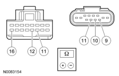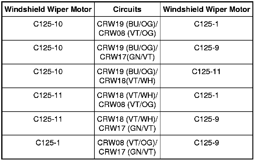 - Measure the resistance at windshield wiper motor C125, harness side, between the circuits shown in the following chart: