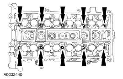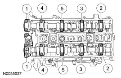 - Loosen the camshaft bearing bolts in the sequence shown, one turn at a time. Repeat until all the tension is released.