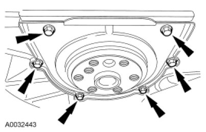 NOTICE: The crankshaft sprocket diamond washer may come off with the crankshaft pulley. The diamond washer must be replaced. Remove and discard the diamond washer. If the diamond washer is not installed, engine damage may occur.