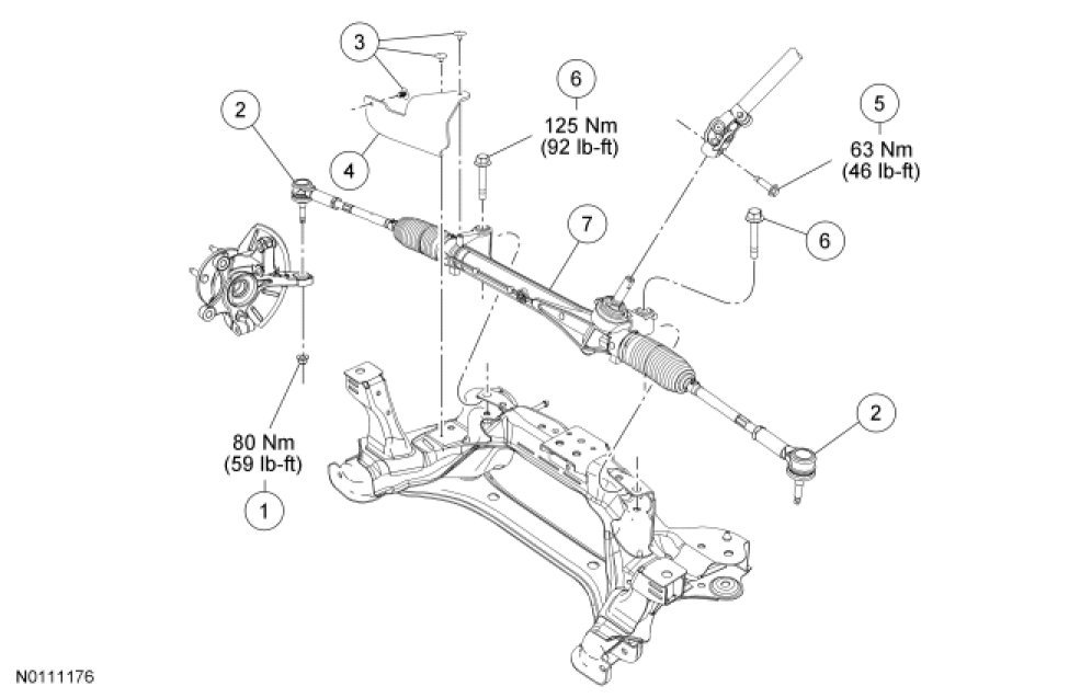 10. NOTE: It may be necessary to lower the rear of the front subframe slightly to provide clearance for removing the steering gear bolts. For additional information, refer to the front subframe exploded view in Uni-Body, Subframe and Mounting System Service and Repair.