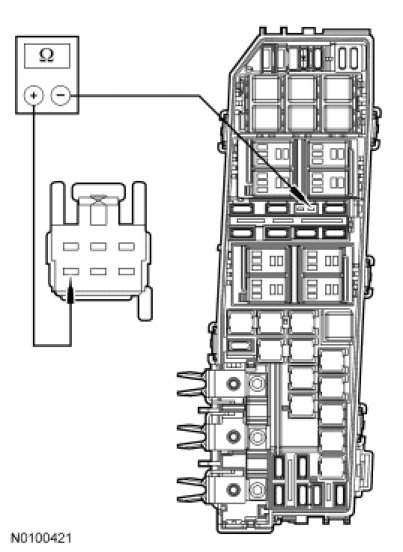 - Measure the resistance between selector lever harness C2096-6, circuit CBP30 (YE/BU) and the output side of BJB fuse 27 (10A).