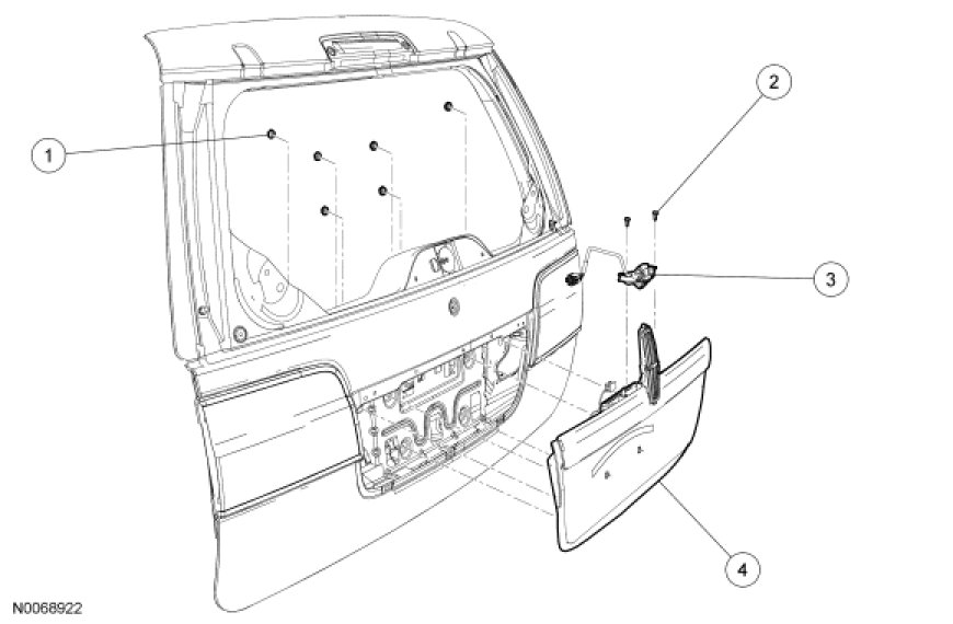 1. Remove the liftgate trim panel. For additional information, refer to Interior Trim and Ornamentation Service and Repair.