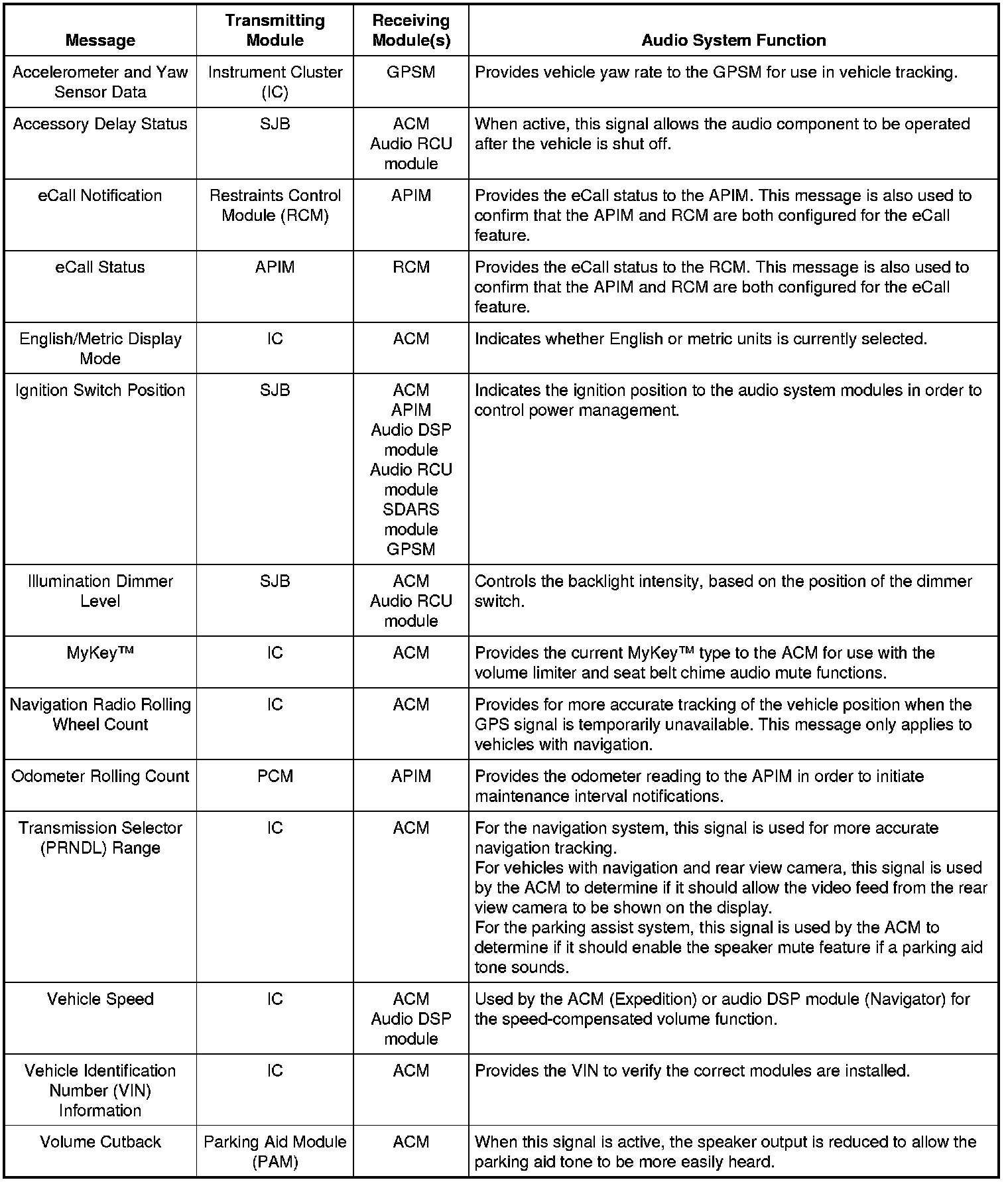 When the audio system enters voice recognition mode, the ACM initially controls the voice recognition feature. The microphone is wired directly to the APIM, which relays the microphone input to the ACM through dedicated wiring. If the first command spoken is part of the ACM voice recognition set, the ACM retains control of the voice recognition and takes the appropriate action(s). If the first command spoken is part of the APIM voice recognition set, the ACM shuts off its own voice recognition and broadcasts a Controller Area Network (CAN) message to the APIM, transferring the voice recognition to the SYNC(R) system and providing the voice command that was spoken. The ACM controls the voice engine for the base audio, navigation, and climate control systems. The APIM controls the voice engine for the SYNC(R) system (USB port, audio input jack, Bluetooth).