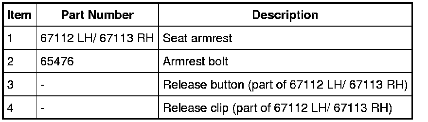 1. Insert a suitable tool below the inboard side of the armrest and push the release button inward at the hinge point. The clip will release and the armrest will slide off the pin.
