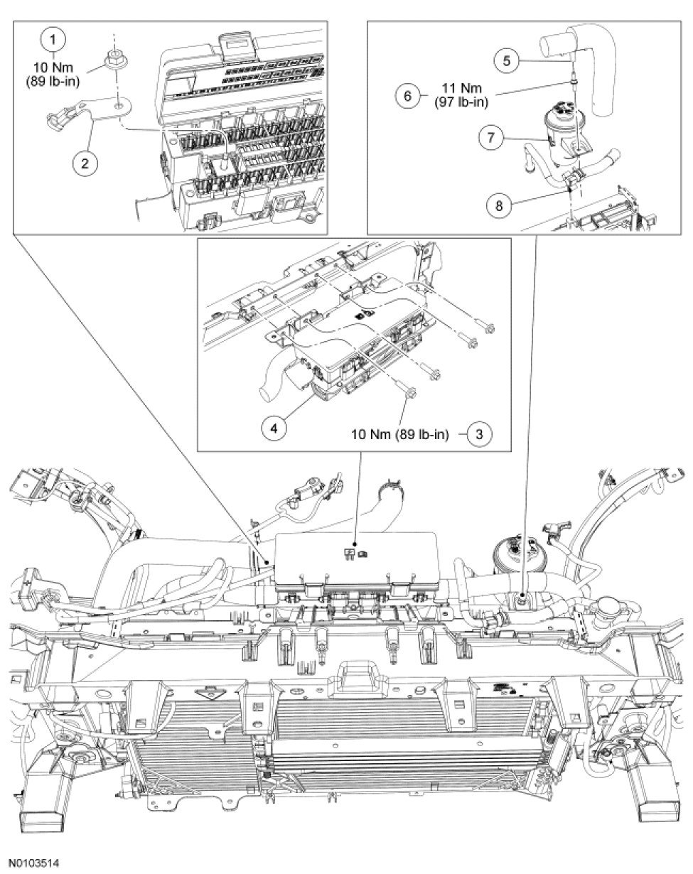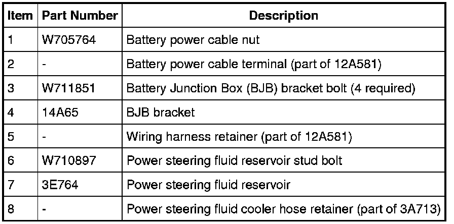 3. Release the 2 tabs and open the Battery Junction Box (BJB) cover. Remove the battery power cable nut and disconnect the battery power cable terminal.
