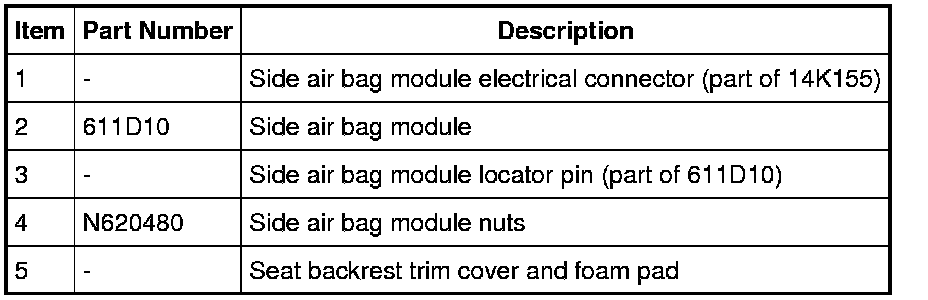 NOTE: If a side air bag deployment took place, a new seat back pad, trim cover, side air bag module and nuts must be installed. The seat back frame should be replaced if necessary. For additional information, refer to front seat backrest disassembly and assembly procedure in Seating Seat Backrest - Front Dissassembly and Assembly.