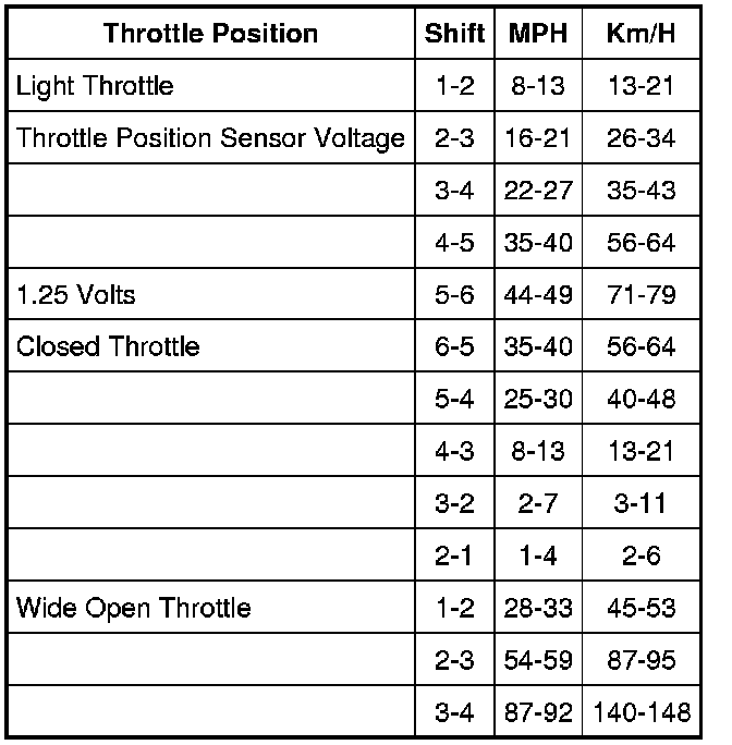 NOTE: Shift speed ranges are approximate for all applications. For specific applications (engine, axle ratio, tire size and application), refer to the Automatic Transmission Specification booklet.