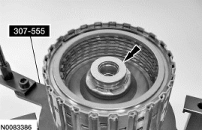 1. Position the Overdrive (O/D) clutch assembly in the Clutch End Play Gauge 307-555 and remove the T3 thrust bearing.