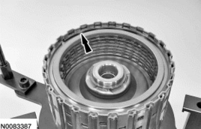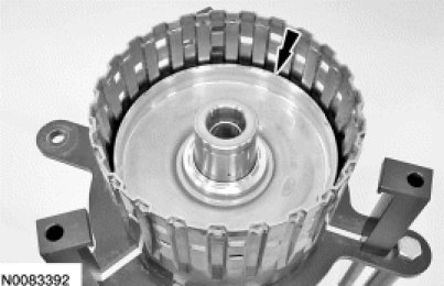 9. Install the new O/D clutch plates, starting with a steel plate and alternating between friction and steel plates, and ending with the pressure plate on the top.