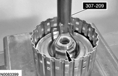 7. Using the Spring Washer Compressor 307-209, install a new O/D clutch balance piston retaining ring.