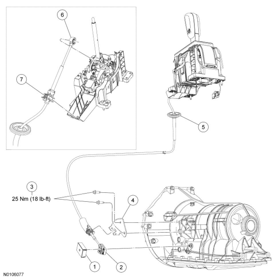 12. NOTICE: To prevent selector lever cable damage, do not apply force to the selector lever cable between the manual control lever and the selector lever cable bracket.