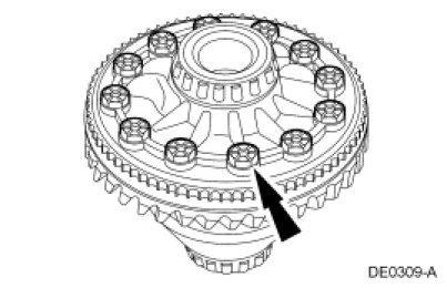 6. NOTICE: Mark the position and location of the differential bearing caps as the arrows may not be visible. Always install the differential bearing caps in their original locations and positions or damage to the components may occur.