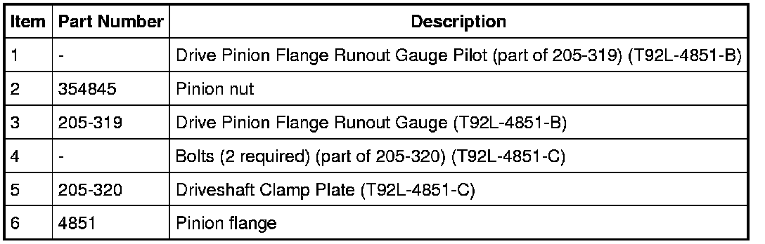 If the flange runout exceeds 0.25 mm (0.010 in), remove the pinion flange, reindex the flange one-half turn on the pinion, and reinstall it. Refer to Rear Drive Axle/Differential - Ford 9.75-Inch Ring Gear Service and Repair or Front Drive Axle/Differential for the flange removal and installation procedures.