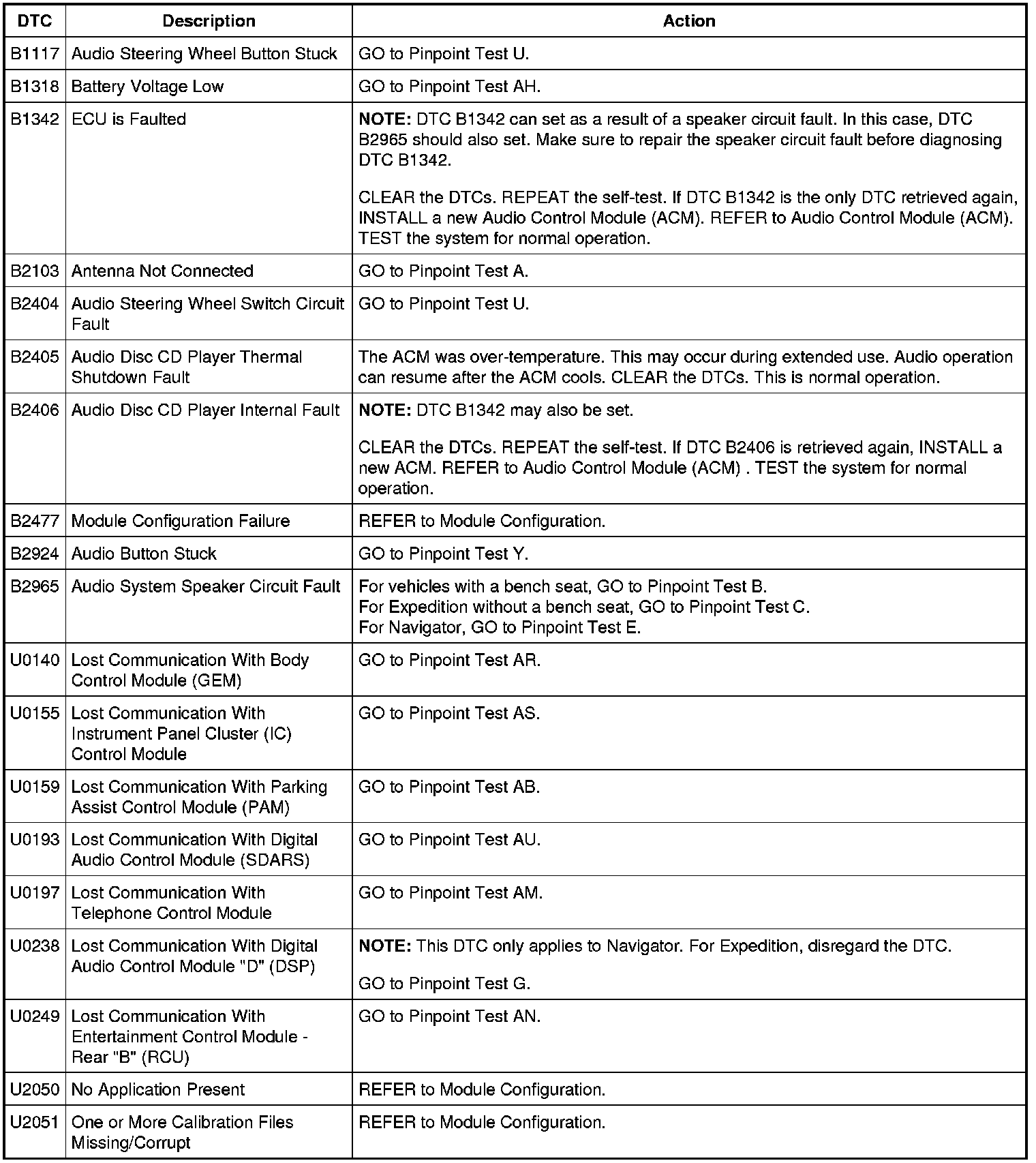 Audio Control Module (ACM) - Without Navigation DTC Chart